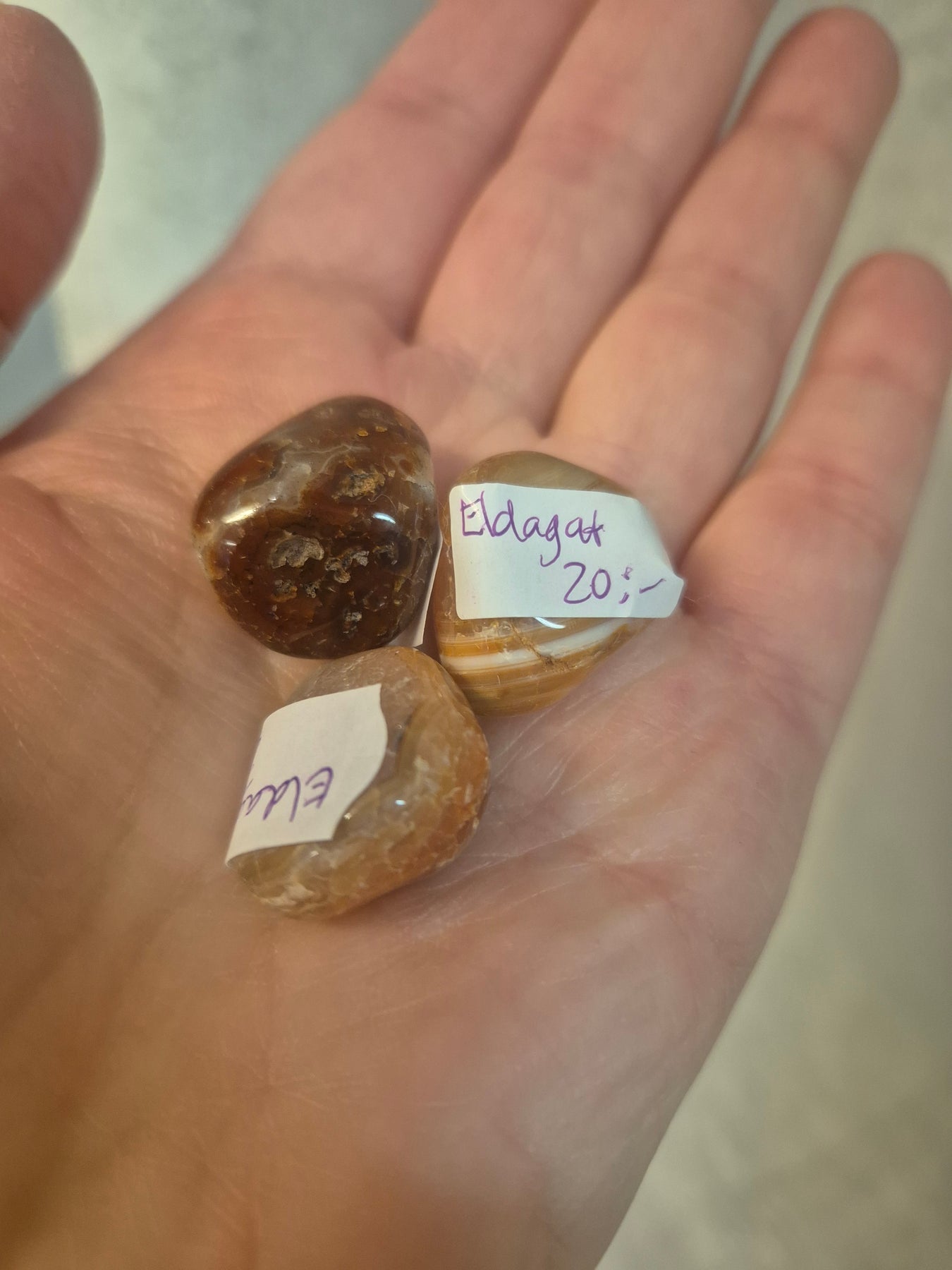 Liten: Trumlad, ca 1,5-2 cm. Färgen varierar från röd, vit till röd, brun.