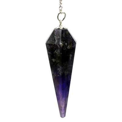 Fasettslipad konform och liten bergkristallkula i änden av kedjan, 6 eller 12 fasetter. Färg/utseende skiftar då detta är en naturprodukt. Själva stenen är ca 40-50 mm lång.