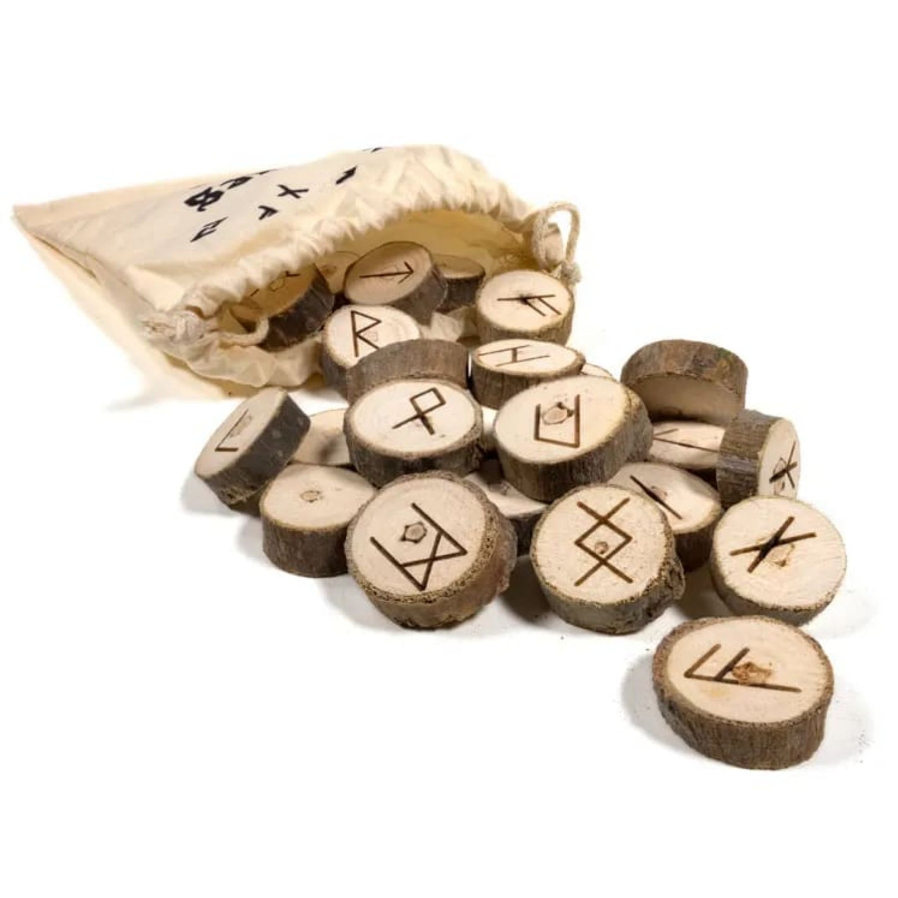 Runor av trä (inkarvade symboler). 25 styck. Levereras i en bomullspåse.