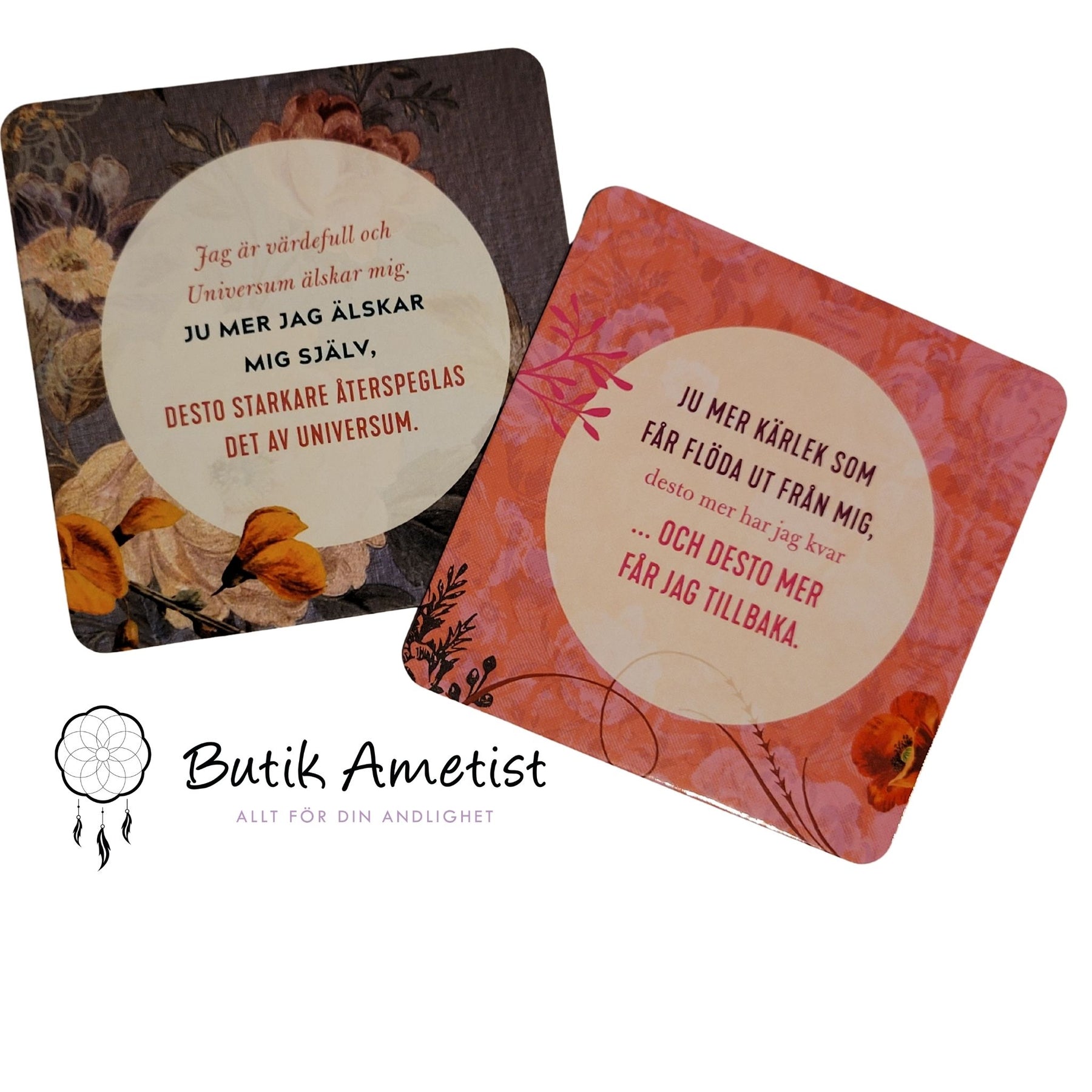 "Den här asken innehåller 64 AFFIRMATIONSKORT (med text på båda sidor) som hjälper dig att vända blicken inåt och se den del av dig som är ren och oförfalskad andlighet. Rent ljus. Ren energi. Se framför dig hur dina begränsningar försvinner, en efter en, tills inget annat än du återstår: trygg, helad och komplett. Oavsett vad som händer i ditt liv just nu och oavsett hur svårt allt må vara, ska du veta att längst inne i ditt innersta är du trygg. Där är du hel. Nu och för alltid."